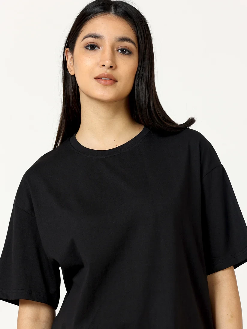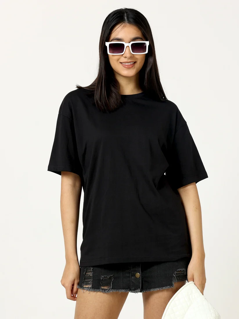 Black Women's Cotton Oversize T-Shirt ek classic aur versatile option hai jo casual wear aur street style ke liye perfect hai. Ye T-Shirt premium quality cotton fabric se bana hai jo soft, breathable aur skin-friendly feel deta hai. Oversize fit relaxed aur modern look provide karta hai, jo jeans, leggings, shorts ya skirts ke saath perfectly pair hota hai. Black color timeless, elegant aur easy-to-style look add karta hai, jo college, weekend outings, shopping trips ya casual gatherings ke liye ideal hai. T-Shirt me fine stitching aur durable fabric hai jo multiple washes ke baad bhi apna shape aur color maintain karta hai. Lightweight aur versatile design ke saath, ye Oversize T-Shirt wardrobe ka must-have fashion essential hai.